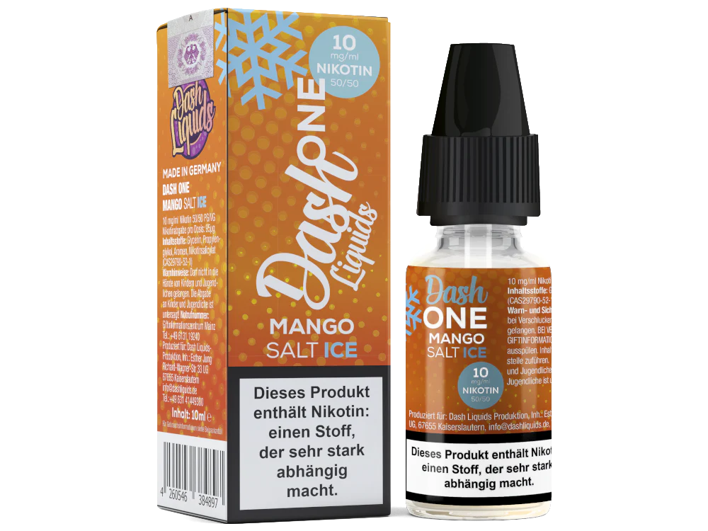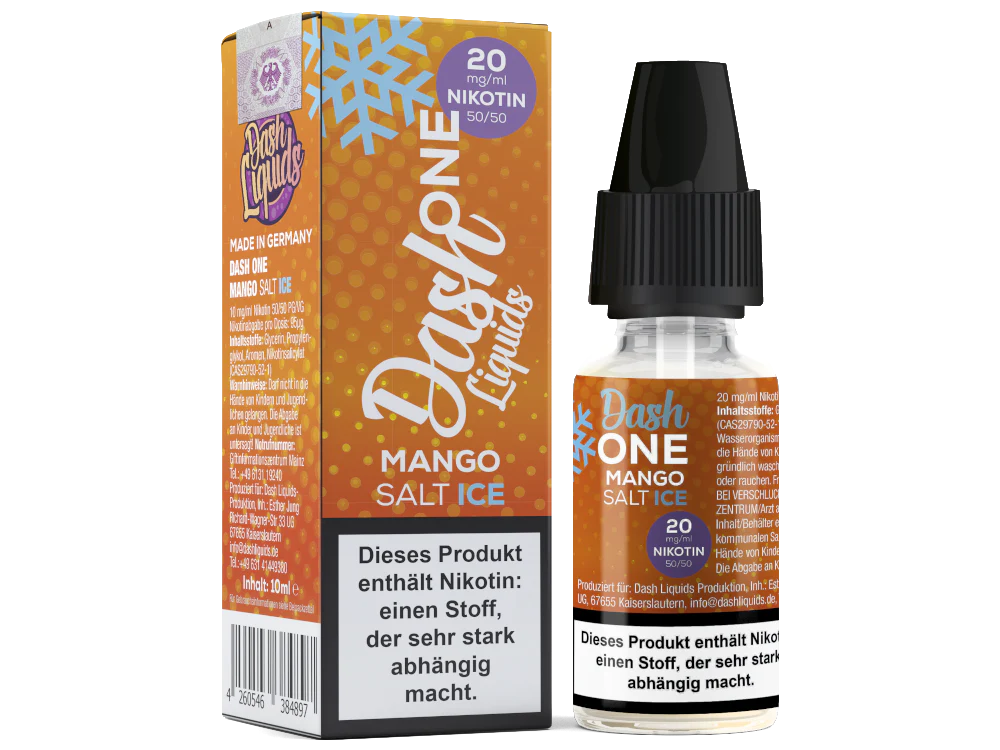 Das Mango Ice Nikotinsalz Liquid aus dem Hause Dash Liquids ist Teil der One-Serie. Beim Dampfen schmeckt es nach Mango mit kühler Note. Sie erhalten pro bestellter Einheit eine 10 ml Flasche mit 10 ml Inhalt. Das Nikotinsalz Liquid können Sie mit 10 mg/ml oder 20 mg/ml Nikotin dampfen. Es ist für den direkten Gebrauch in Ihrer E-Zigarette geeignet.Auszeichnung gemäß CLP-Verordnung (EG) Nr. 1272/2008