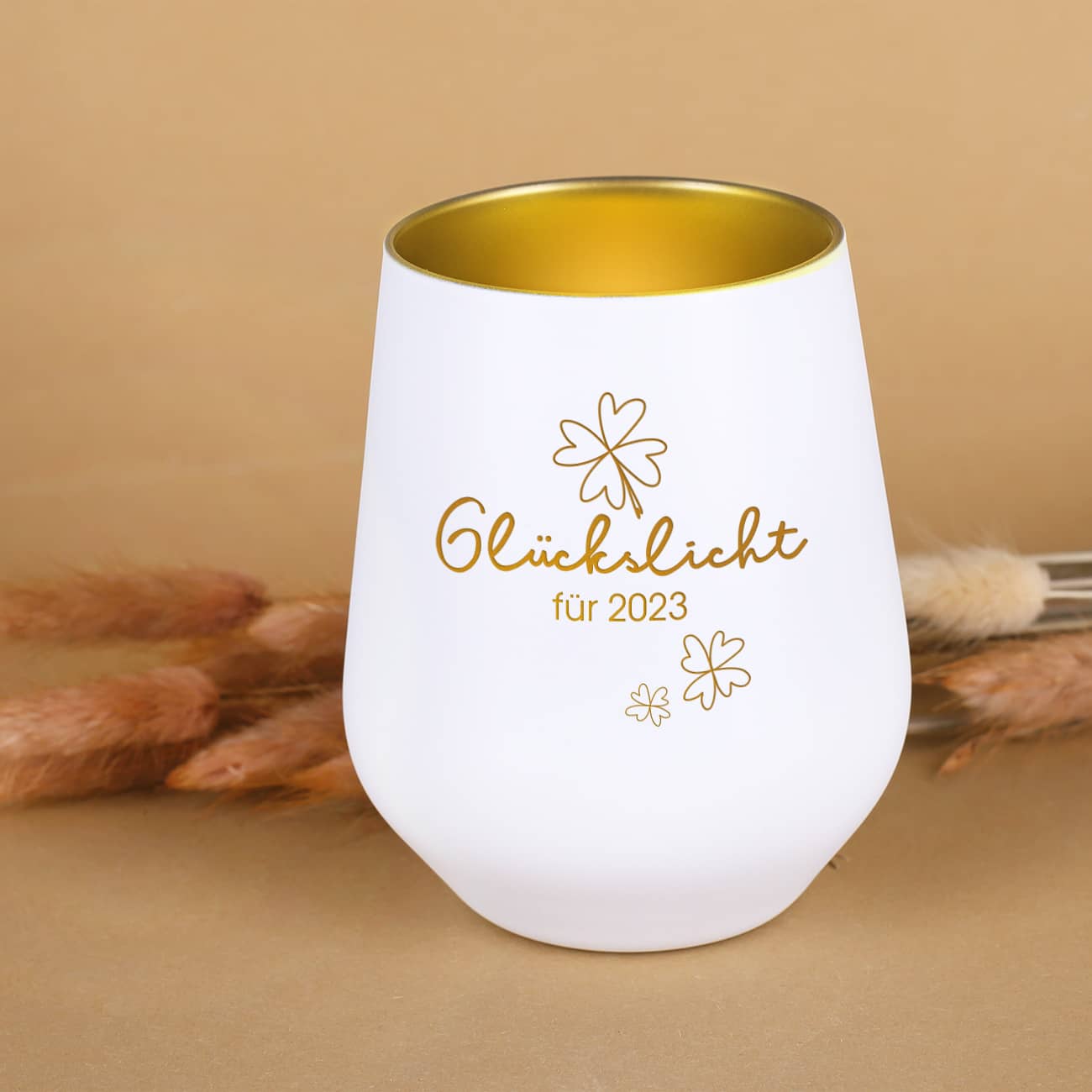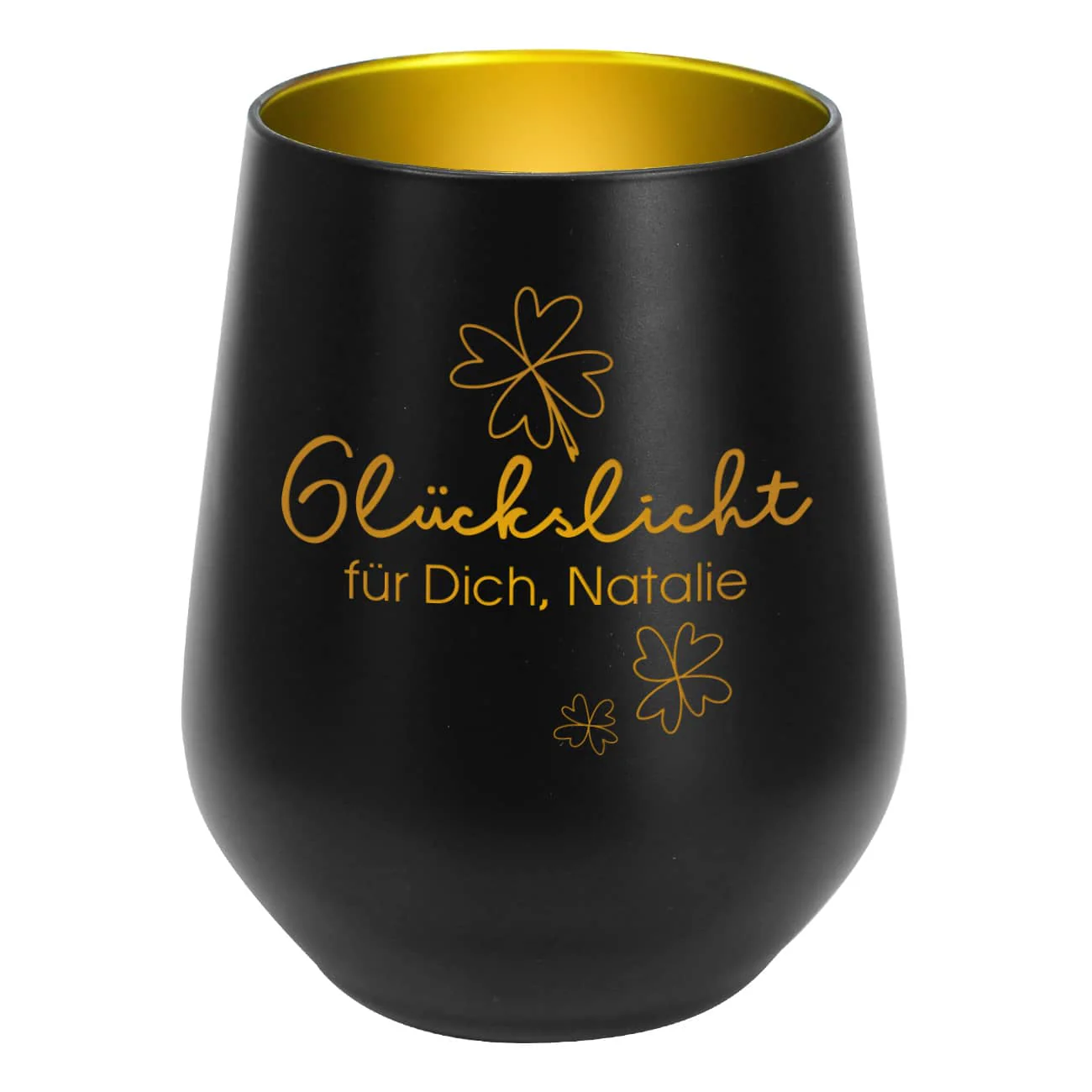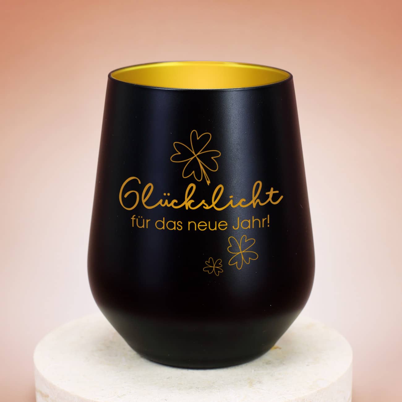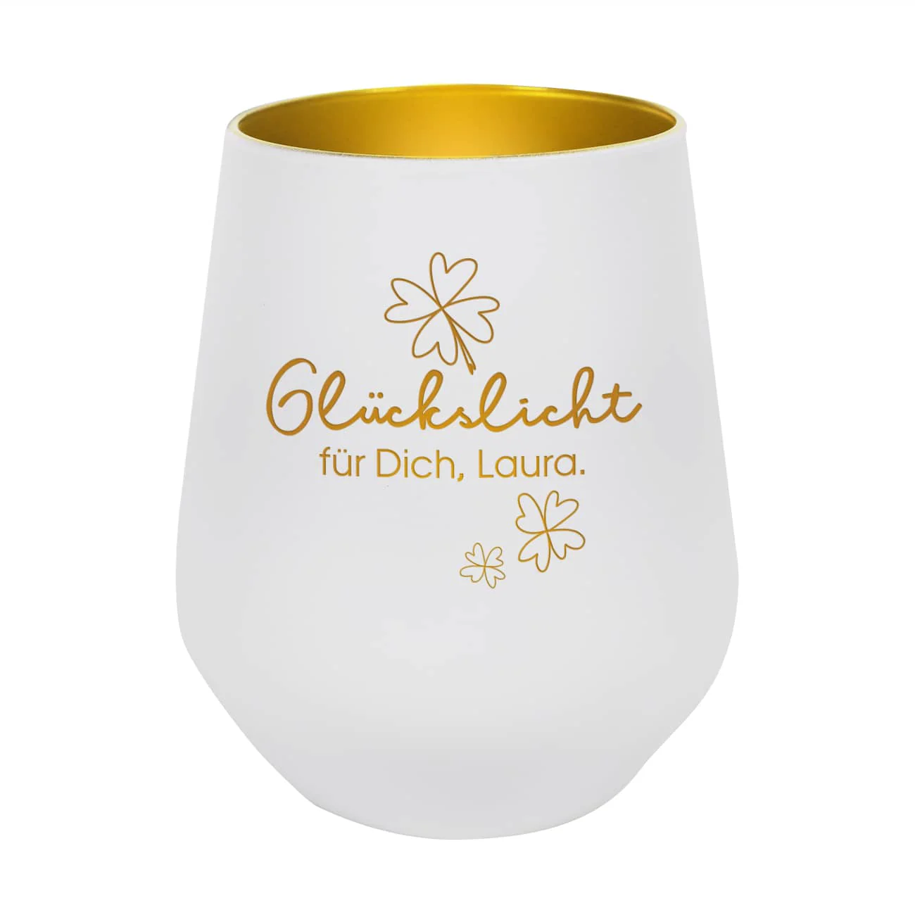 Ein edles und durchdachtes Geschenk ist dieses Glückslicht. Hierbei handelt es sich um ein Windlicht in Weiß-Gold oder Schwarz-gold, das mit einer persönlichen Gravur versehen wird. Dabei wird nur die weiße matte Außenschicht abgetragen, so dass der Schriftzug in einem edlen Gold erscheint. Wenn also drinne eine Kerze scheint, dann erscheint die Gravur in einem warmen Gold und verbreitet einen angenehmen Kerzenschein. Das Motiv beinhaltet ein Motiv aus vierblättrigen Kleeblättern, dem Schriftzug „Glückslicht“ und einem Text nach Ihrem Wunsch. Schenken Sie Ihren Liebsten eine kleine Portion Glück und gute Laune in Form dieses personalisierten Geschenks. Wird etwas Glück benötigt, dann muss nur ein kleines Teelicht angezündet werden!