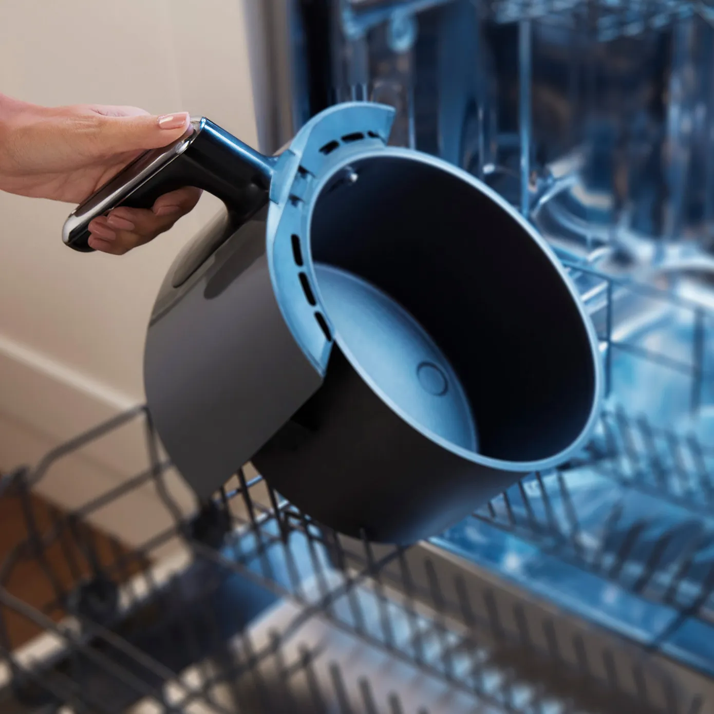 Karaca Air Cook ist auch sehr einfach zu reinigen! Sie können sowohl die abnehmbare Schüssel als auch den Grillrost in der Spülmaschine reinigen, wodurch das in der Schüssel angesammelte Fett leicht entfernt werden kann.