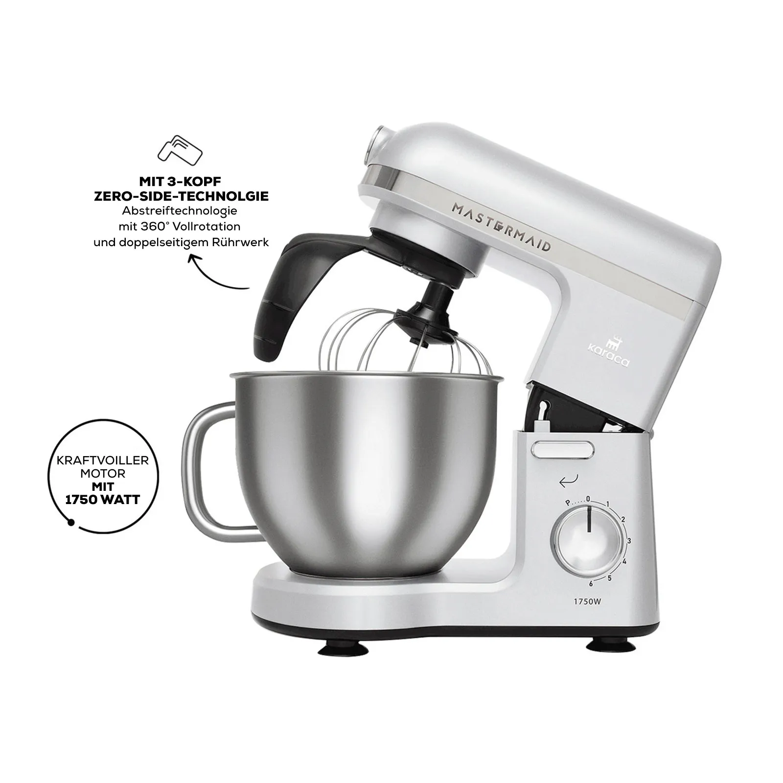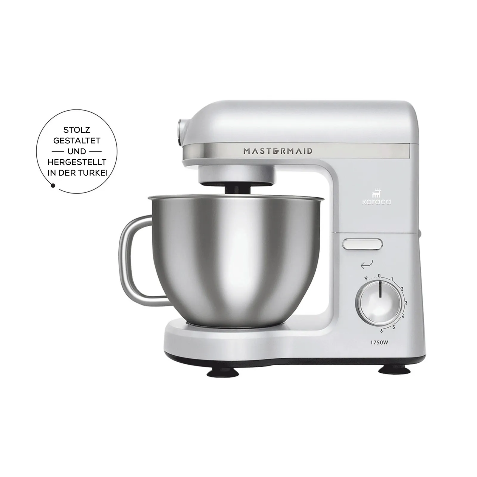 • Die Matermaid Chef Pro leistet mit ihrem erneuerten, extrastarken Motor von 1750 W Höchstleistungen beim Quirlen, Mixen und Kneten.