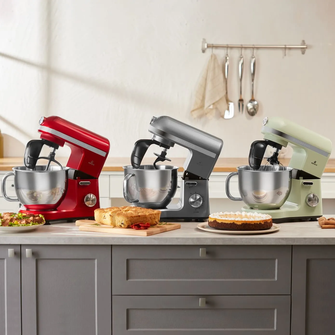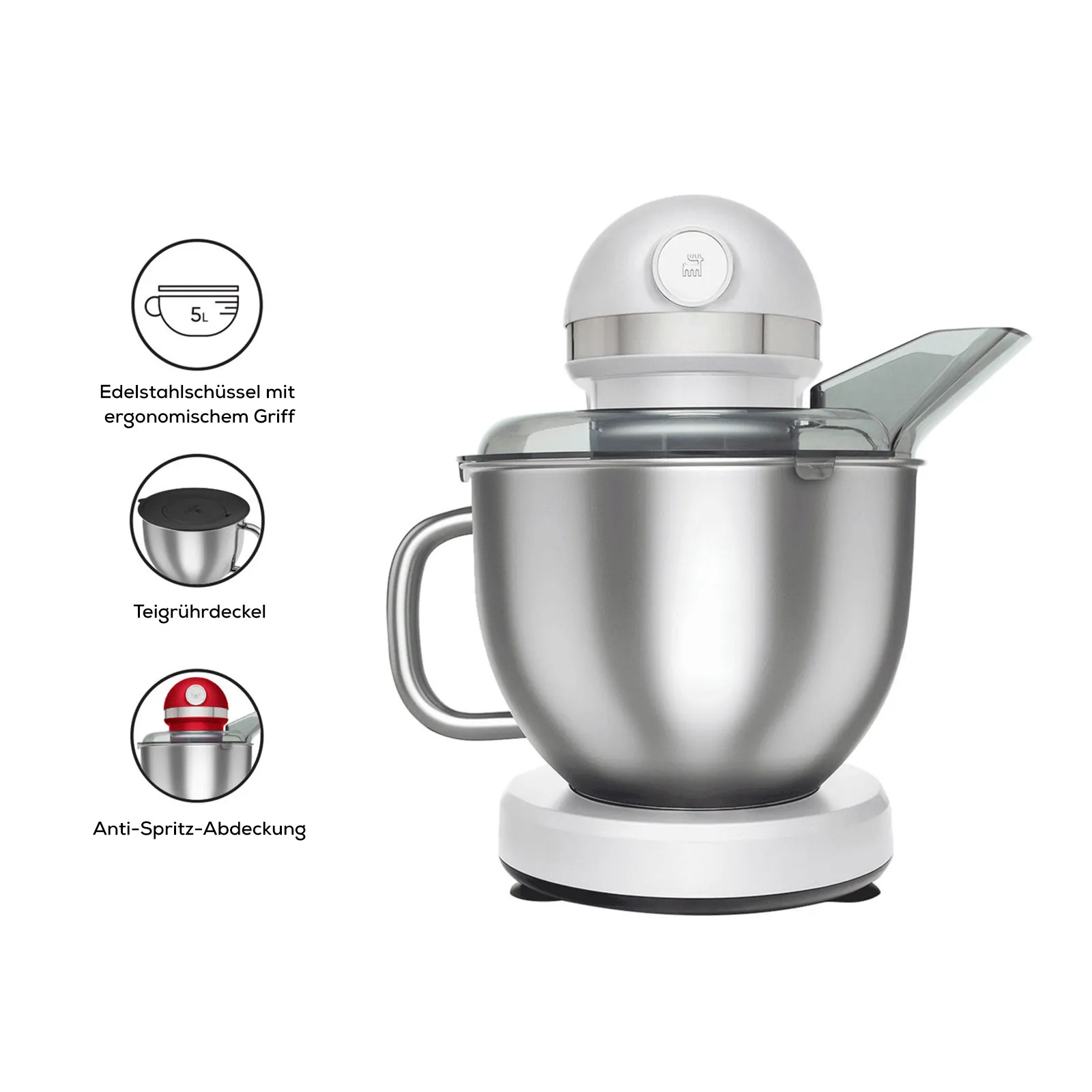• Mit seinem speziell entwickelten Doppelarmapparat, Knethaken, Ballonrührer und Flachrührer, dreht er sich um eine volle Umdrehung in die entgegengesetzte Richtung, so dass keine Lebensmittelreste in der Schüssel zurückbleiben und Sie homogenere Mischungen erhalten.