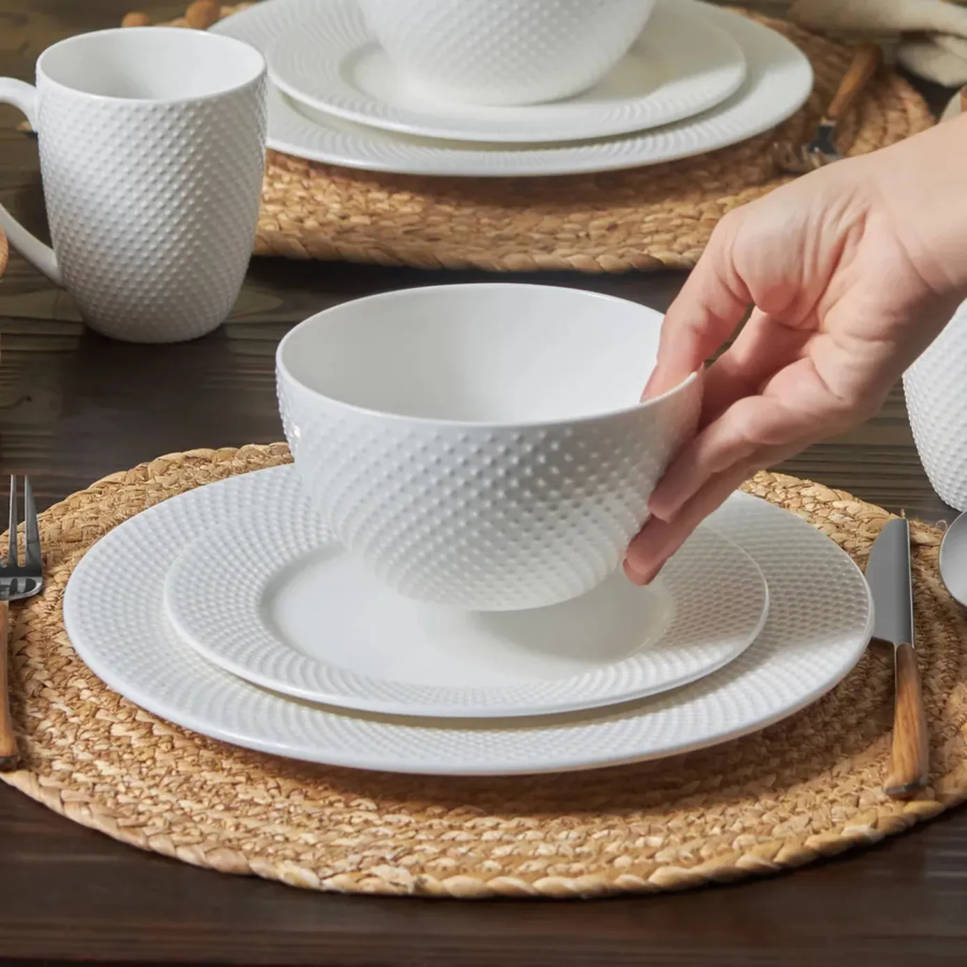 Karaca Punto Embossed für 4 Personen Geschirrset, 16 Teilig, New Generation Bone, Weiß