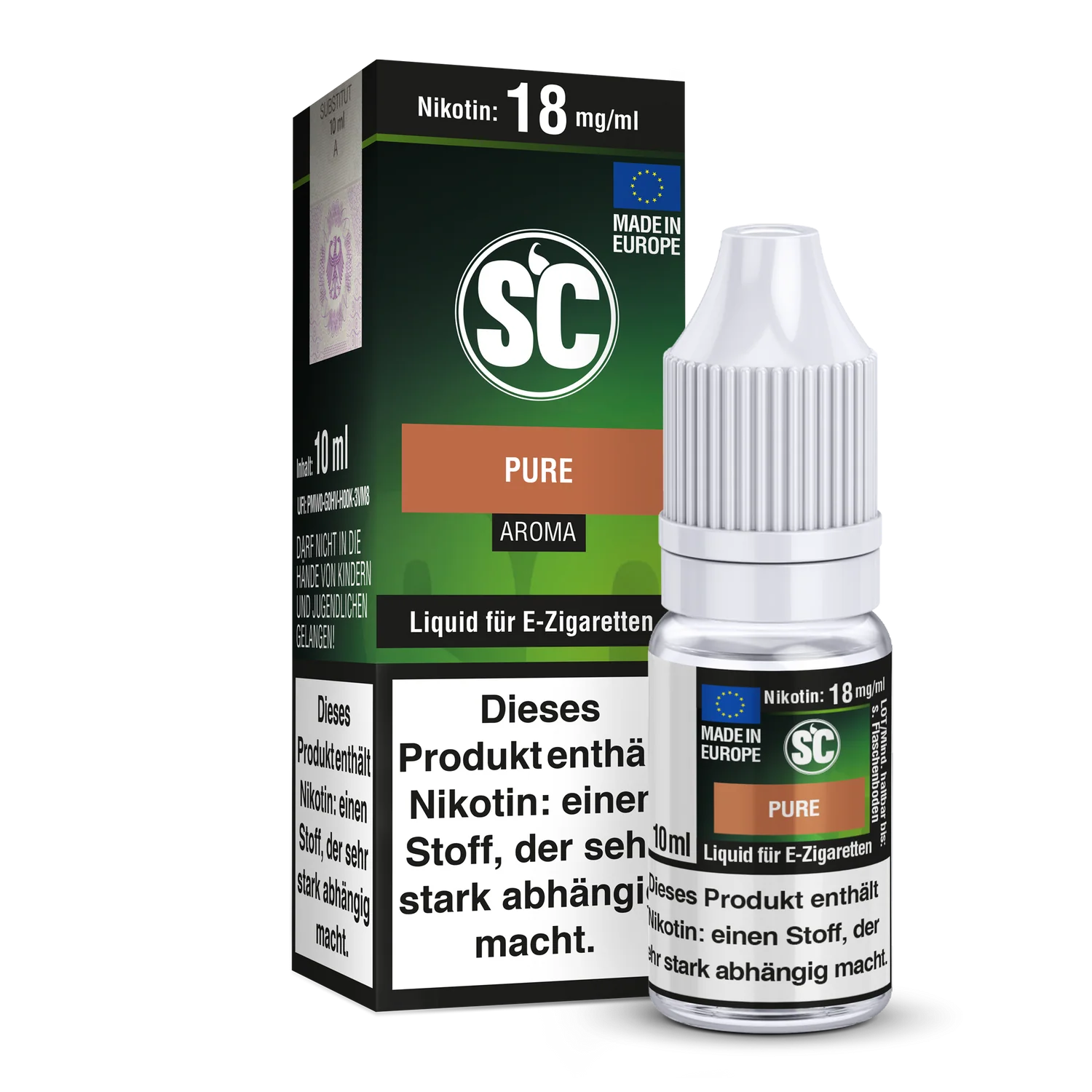 Mit jeder SC Liquid Flasche, erhalten Sie 10 ml Liquid von dem gewählten Liquid Aroma und der gewählten Stärke. Ihnen stehen insgesamt 5 Stärken mit und ohne Nikotin zu Auswahl. Das SC Pure Tabak E-Zigaretten Liquid schmeckt beim Dampfen nach Tabak.