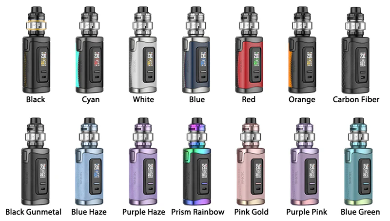 Das Smok MOK Morph 3 Kit wird mit zwei 18650/20700/21700-Batterien betrieben (nicht im Lieferumfang enthalten), 5–230 W Ausgangsleistung, die Lederverzierung an der Seite sorgt für ergonomischen Halt. Der T-Air Subtank hat ein Fassungsvermögen von 5 ml, ist auslaufsicher und von oben befüllbar.