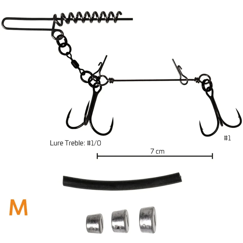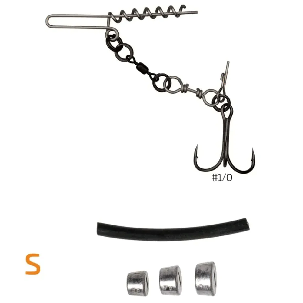 Das Zeck Softbait System + Screw Set gibt es in 3 verschiedenen Größen für verschieden große Gummifische. Dabei hat man bei jedem Set die Wahl, ob man es unbeschwert oder inklusive der 3 Wechselgewichte fischt. Die Wechselgewichte sind 5, 7 und 9 g leicht und haben alle die Gewichtsangabe eingeprägt. So hast du die Möglichkeit das Rig nach eigenen Wünschen im Sink- und Laufverhalten anzupassen. Der Screw vom Rig wird in den Kopf gedreht und die Haken über den Baitholder-Stift am Bauch fixiert. Für maximale Beweglichkeit im Drill wurde anstatt Stahlvorfachmaterial eine Kombination aus Wirbel und Springringen verwendet. So kann sich der Hechte um die eigene Achse drehen, ohne das Rig zu verdrehen. Das bedeutet mehr Robustheit und eine höhere Langlebigkeit.