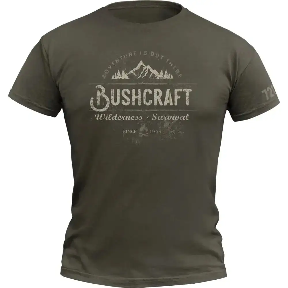 Für alle Bushcrafter und Survival-Fans ist dieses Shirt gemacht. Eine Berglandschaft mit der Überschrift „Adventure ist out there“ zusammen mit „Wilderness und Survival“ ist auf der Brust aufgedruckt. Mit 720er Schriftzug auf dem Oberarm und Logo-Print im Nacken.