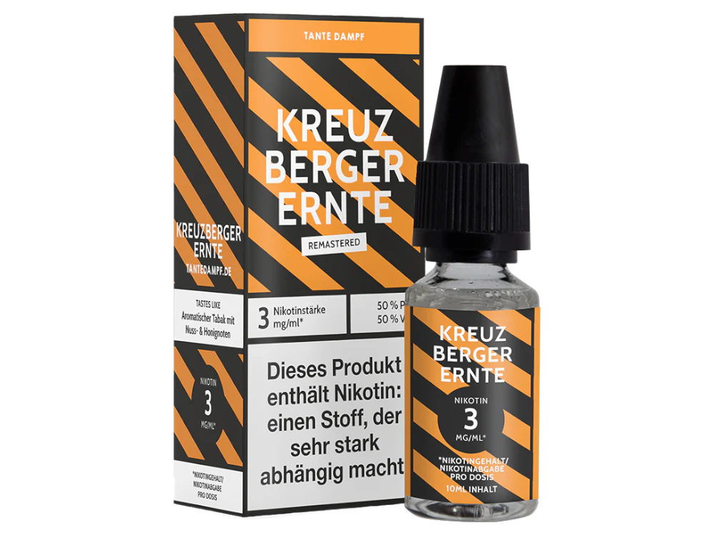 Von der deutschen Marke Tante Dampf erhalten Sie das gebrauchsfertige Liquid Kreuzberger Ernte Remastered. Dieses entfaltet beim Dampfen den Geschmack von Tabak mit einer Nuss- und Honignote. Sie können hierbei zwischen drei verschiedenen Nikotinstärken wählen. Pro bestellter Einheit erhalten Sie eine 10 ml Flasche, die mit ebenso viel Liquid befüllt ist.Auszeichnung gemäß CLP-Verordnung (EG) Nr. 1272/2008