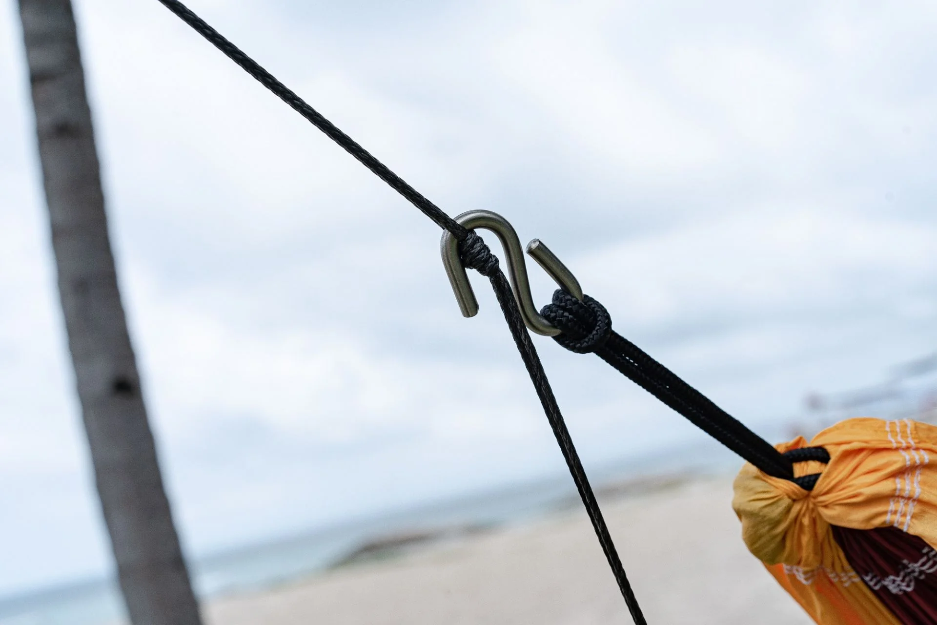 Das dünne Seil wird um den Baum gelegt und durch die Schlaufe der Tree-Hugger am anderen Ende geführt. Einfach anziehen, die Hängematte auf der passenden Höhe in einen der Knoten einhängen – und fertig!