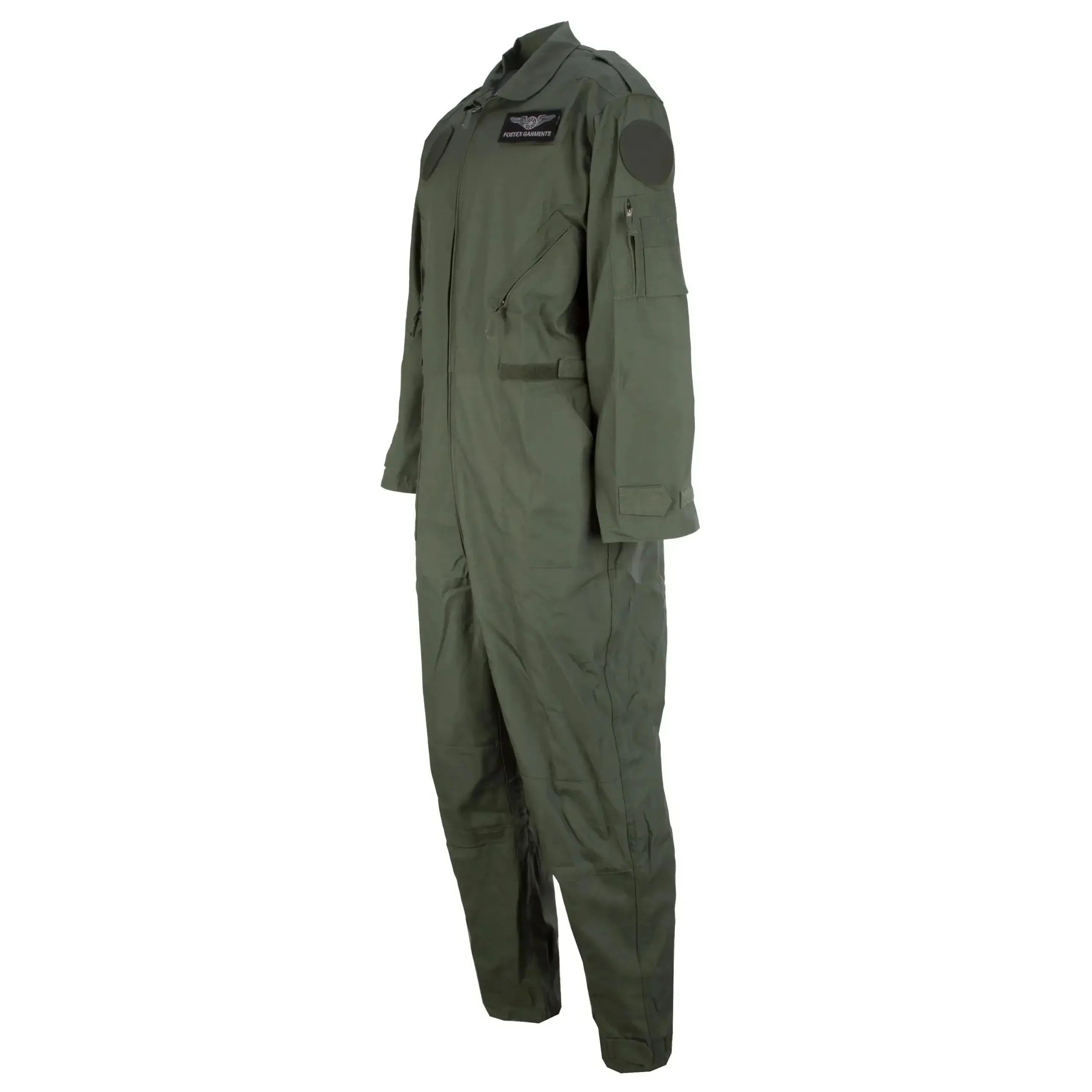 Nachbau des US Fliegerkombis mit 2-Wege-Front-RV und hinterlegter Windleiste. 2 schräge RV-Brusttaschen. 2 Schubtaschen. RV-Ärmeltasche links mit Stiftköcher. Bequeme Dehnfalte im Schulter-Rückenbereich sowie Bewegungsfalten im Kniebereich. Taillenregulierung per Klettband. Ärmel- und Beinabschluss regulierbar per Klettband. Schulterklappen mit Klett. Abnehmbare Patches auf der Brust und den Ärmeln.